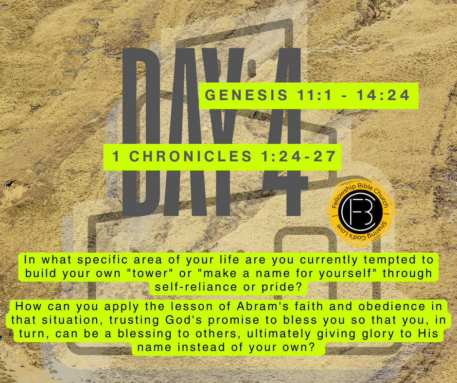 Read: Genesis 11:1-32 ; 1 Chronicles 1:24-27 ; Genesis 12:1-20 ; Genesis 13:1-18 ; Genesis 14:1-24